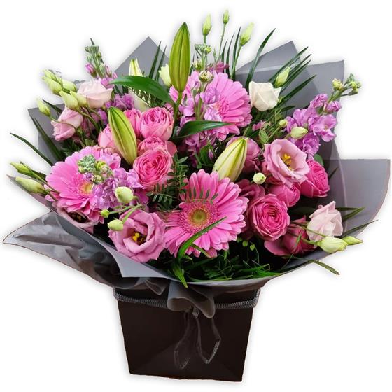 A graceful bouquet in shades of pink, combining pale lisianthus, blush rose sprays, soft gerberas and tender lilies, with cerise stock accents and feathery foliage, beautifully arranged in a chic box for a gentle touch.