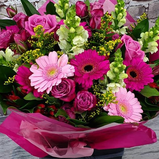 A joyful festive mix brimming with vibrant pinks, rich berry tones, crisp whites and glowing seasonal foliage. This cheerful arrangement is designed using fresh flowers and natural textures for a warm Christmas feel, perfect for brightening any home this season.