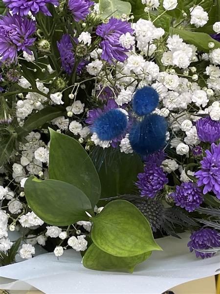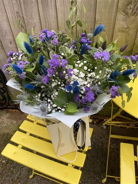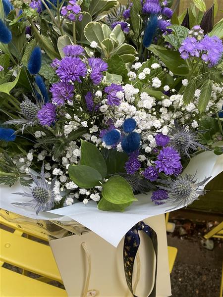 Handtied purple and blue blooms in gift bag and aqua packed
